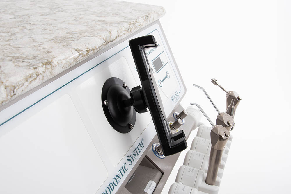 A number of W&H electric high/low speed motors may be integrated into the ASI dental delivery systems. These motors function similarly to air driven high speed connections, providing water spray, fiber optic illumination and chip air. The motors operate universal E style handpiece connections geared to provide equivalent speeds to high speed handpieces, but with additional torque that prevents stalling. The motors can be equipped with 1:1 ratios or reduction ratios to allow them to operate like a lowspeed handpiece. Due to their quiet operation, additional cutting torque and adjustability, many dentists find it very useful to include two motors on the delivery system. One motor is utilized as a high speed and the second as a low speed.