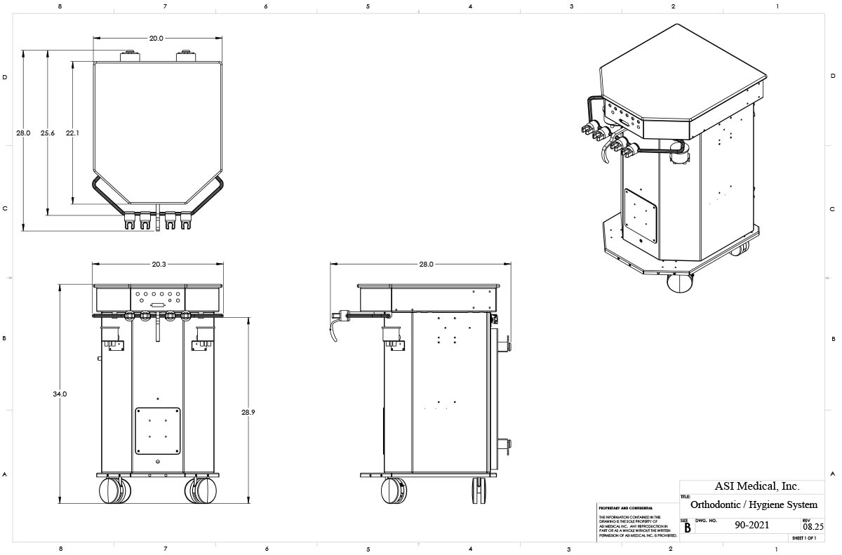 The Orthodontic/Hygiene dental cart is a fully self-contained portable dental delivery system. It is internally equipped with a water system, an internal oil-less air compressor, and suction system. The air system powers handpieces and pressurizes the water system, while the suction system allows operation of the included titanium high volume evacuator (HVE) and saliva ejector. A connection to central utilities is not required. Just plug it into a standard electrical outlet.