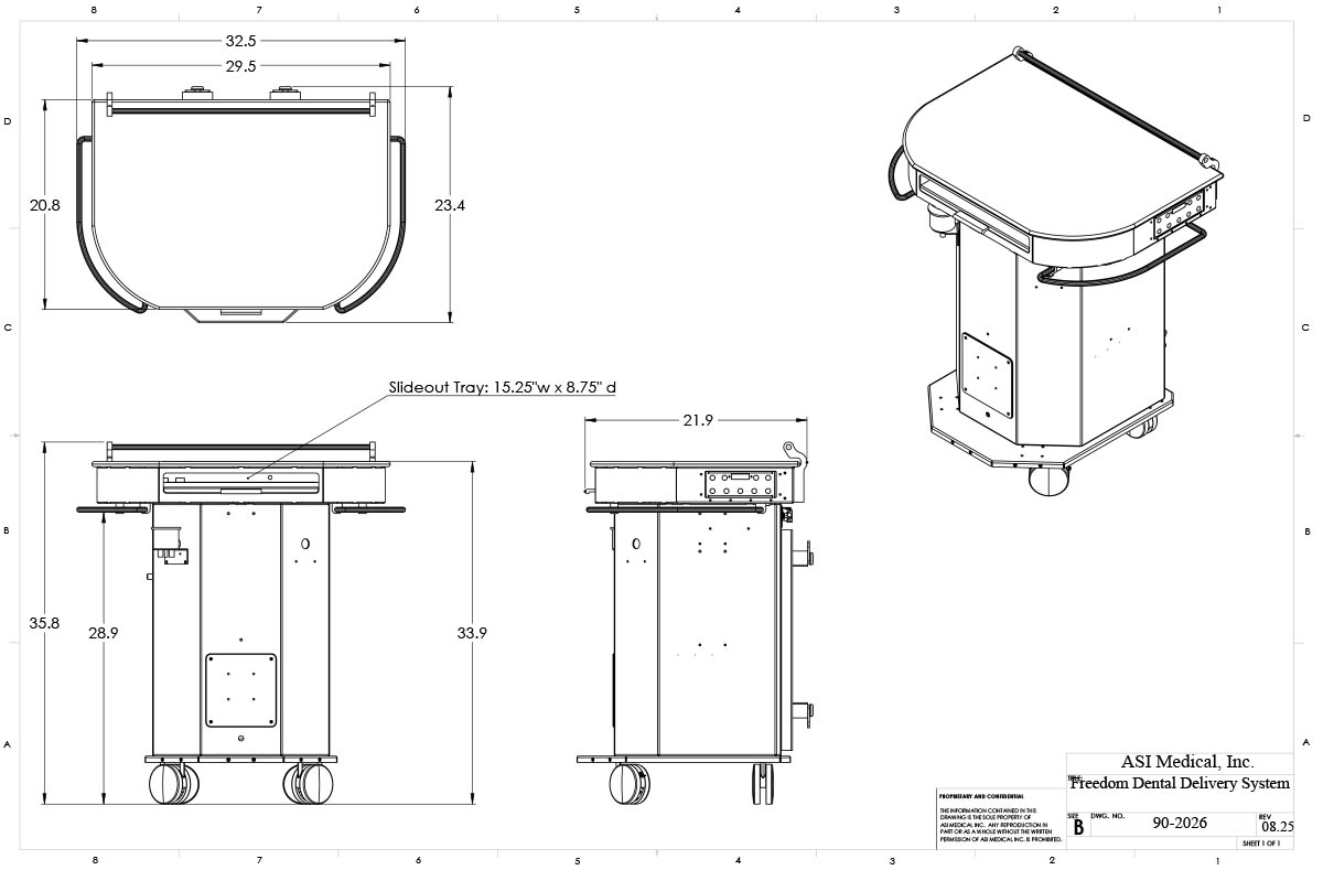 The Freedom Cart Dental System is a fully self-contained dental delivery system. Central utility connections are not required. Just plug it into a standard electrical outlet (see ASI Power Chassis for more details).