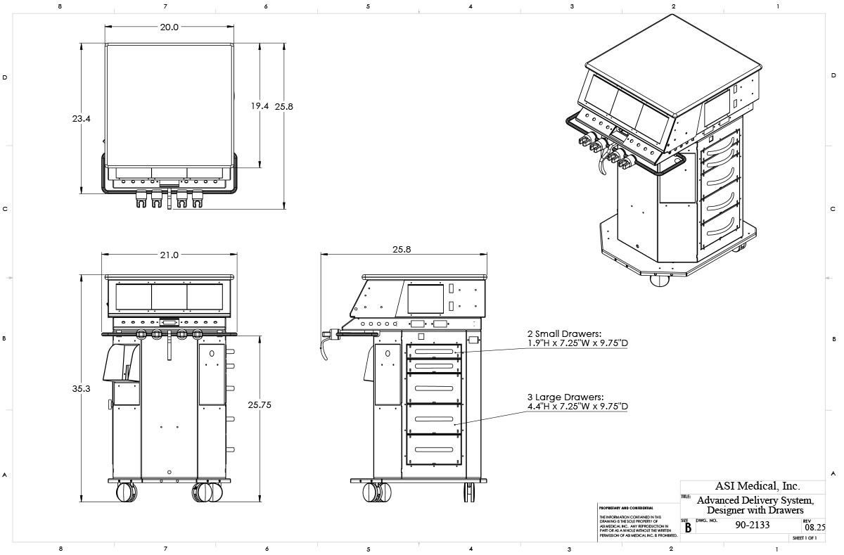 The Designer Drawer Model features a door on one side of the unit and a set of four storage drawers on the other. The dual closed water system and optional irrigation bottles are housed inside the door. The drawers are located on the opposite side of the door, and are great for storing smaller items for convenient access within the operatory.