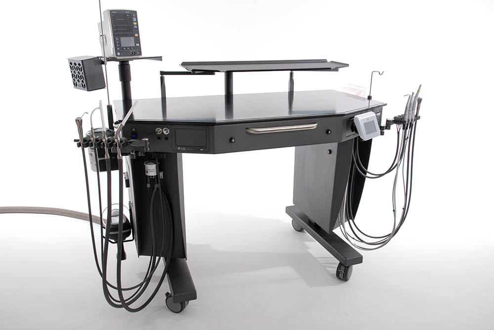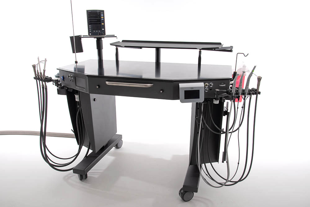 Its advanced design features integrated suction, and convenient access to handpieces on both sides of the table for both doctor and assistant to work efficiently and achieve optimized workflow. Integration of electric or surgical motors allows oral surgeons and implant specialists to seamlessly perform procedures. The large surface area and comprehensive design of The Glider™ facilitates an operatory space-saving solution, as it eliminates the need for multiple carts, stands, and awkward reaching for select instrumentation. Its electronic power control makes for quick and easy height adjustment and the sturdy, yet lightweight design accommodates ease of positioning within the operatory.